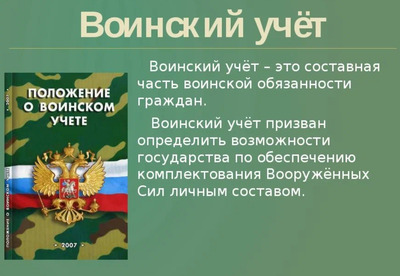 - Цель воинского учета: Обеспечение исполнения гражданами воинской обязанности, а также оперативное обеспечение мобилизационных потребностей страны.