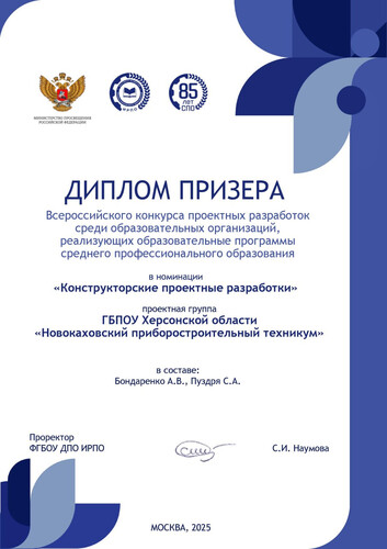 ГБПОУ ХО «Новокаховский приборостроительный техникум» принял участие во Всероссийском конкурсе проектных разработок среди образовательных организаций (организатор: ФГБОУ ДПО «Институт развития профессионального образования»), реализующих образовательные программы СПО в номинации «конструкторские проектные р